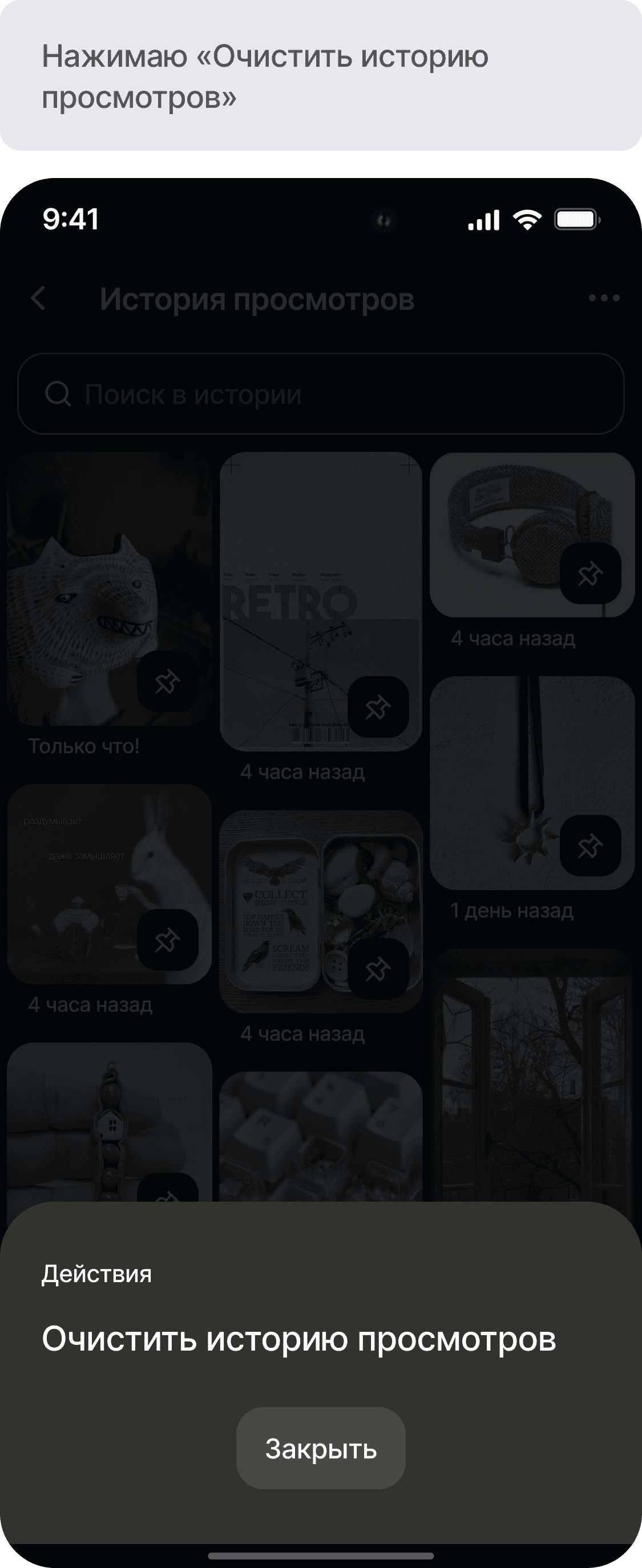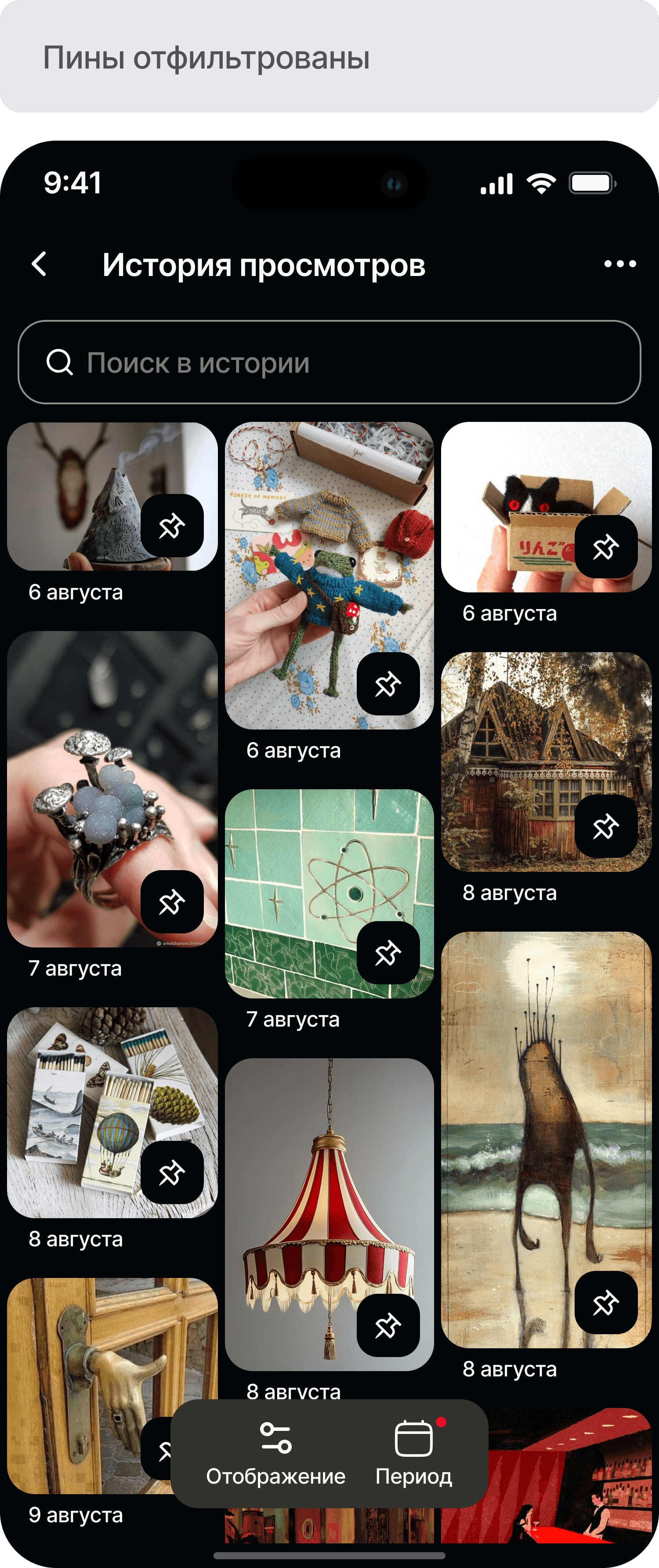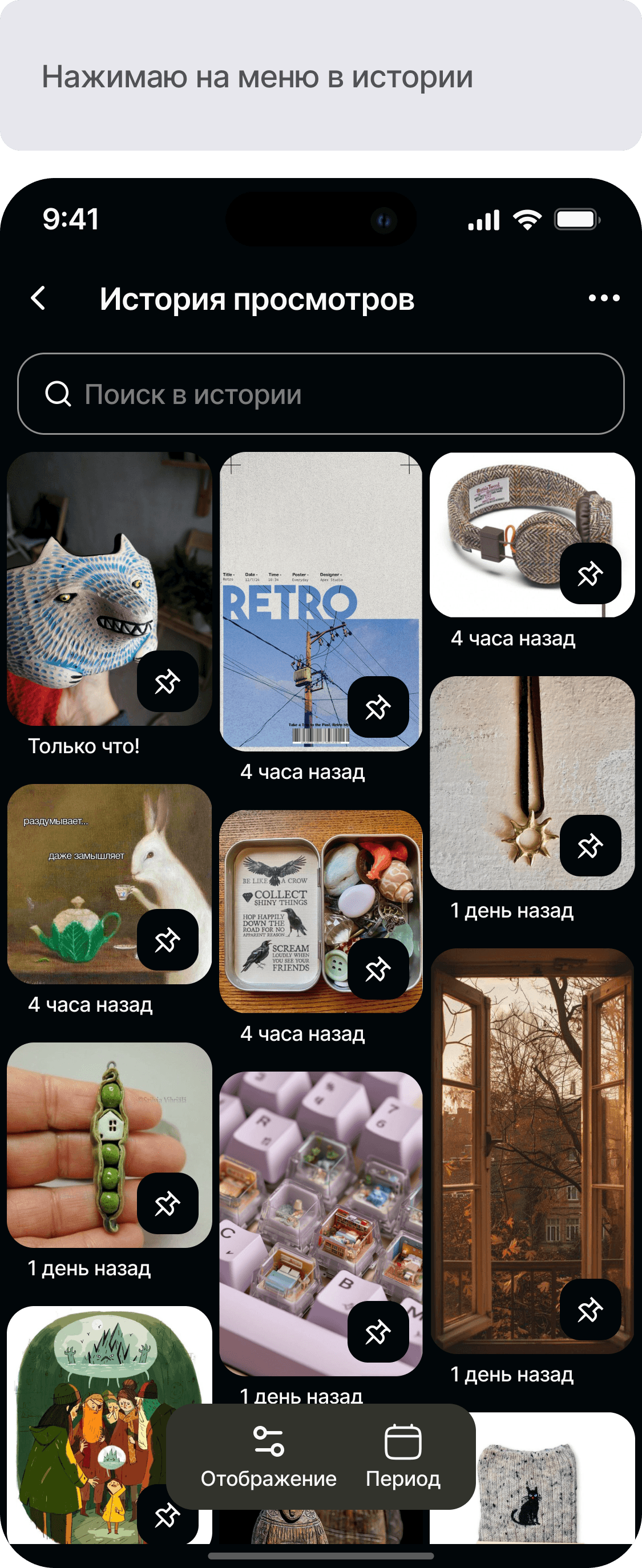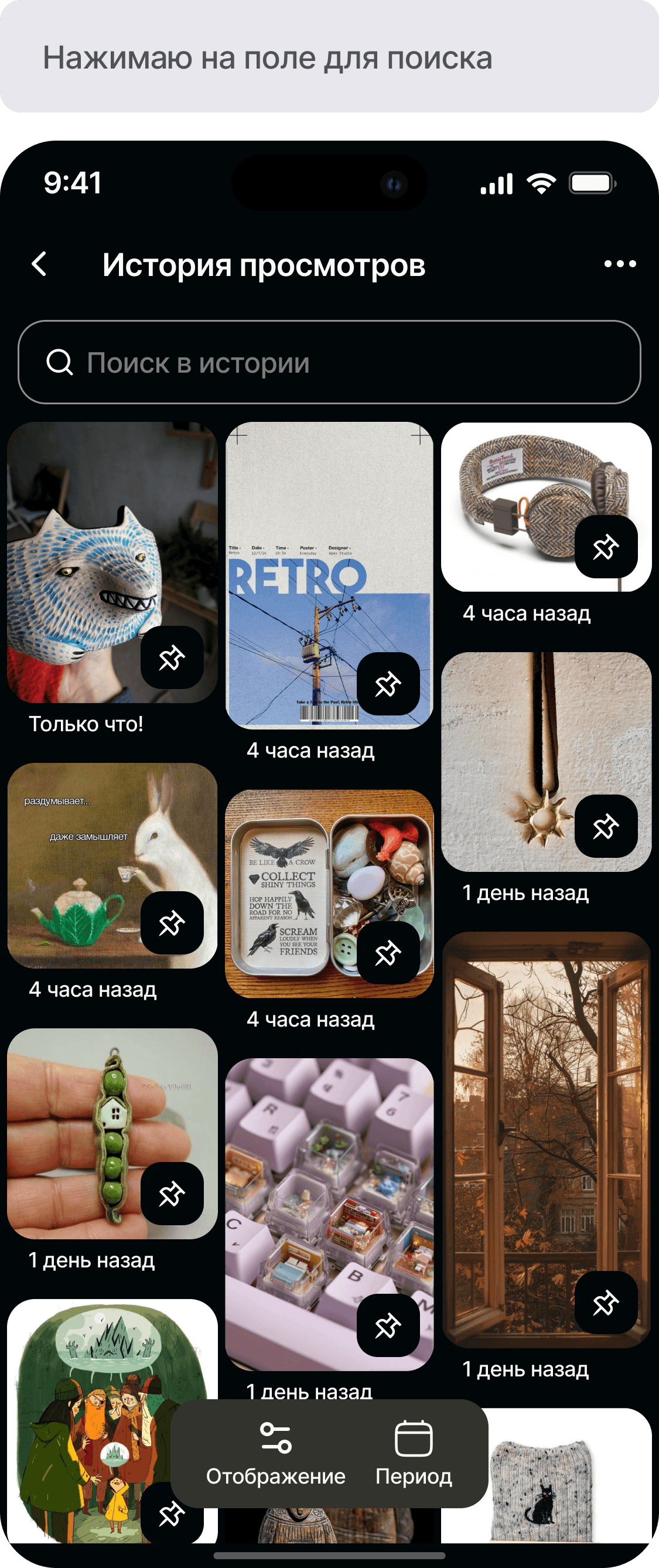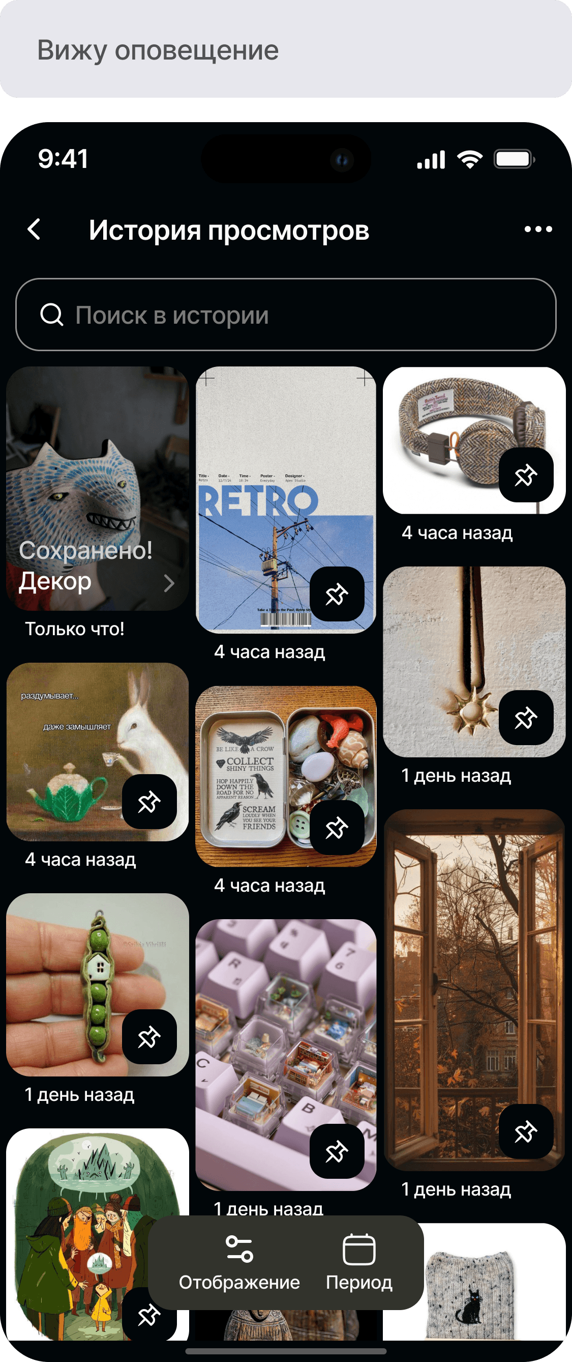 Разработать функционал истории просмотров для приложения Pinterest