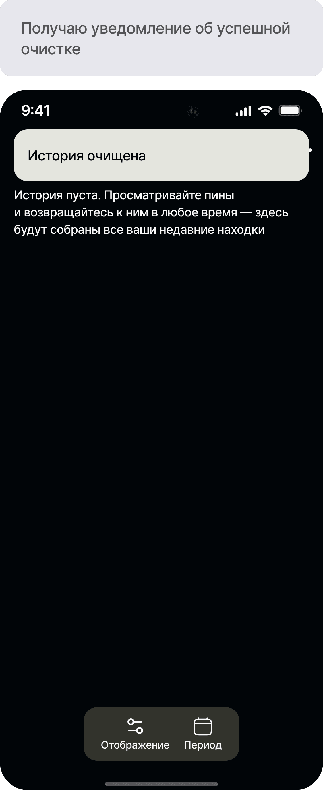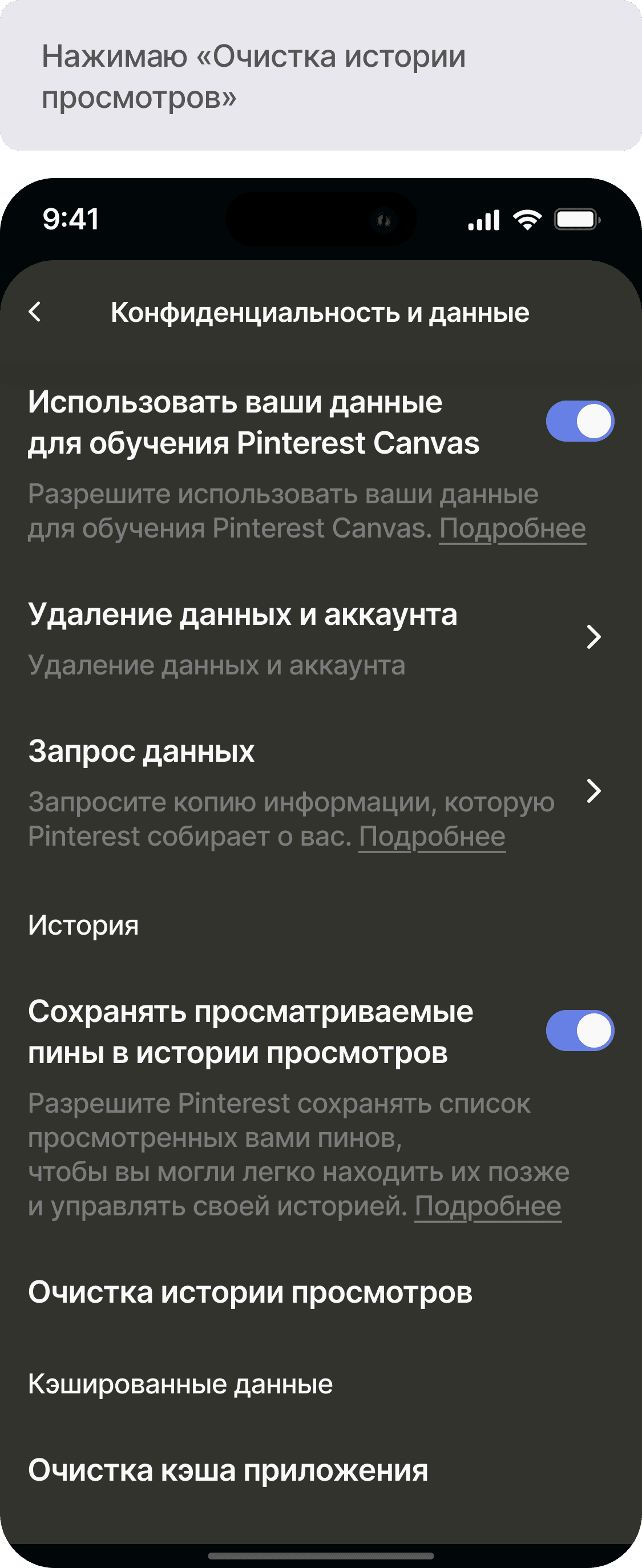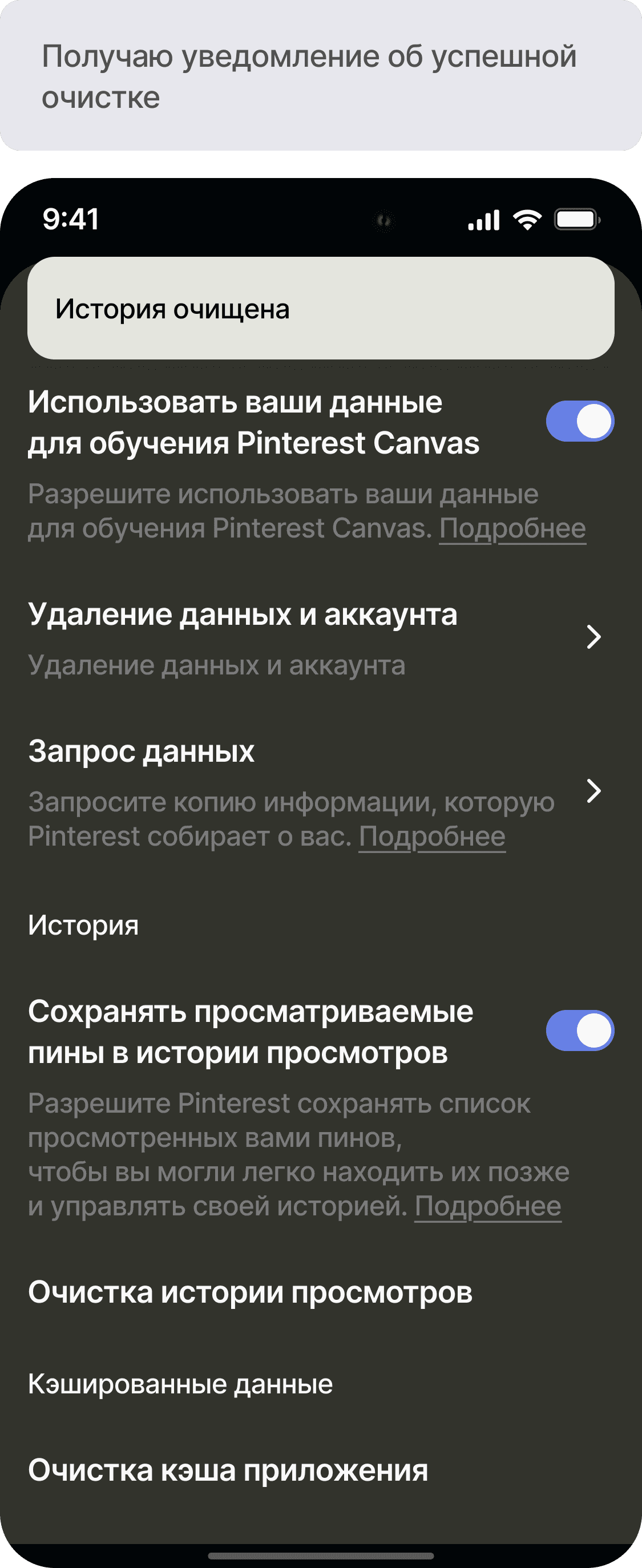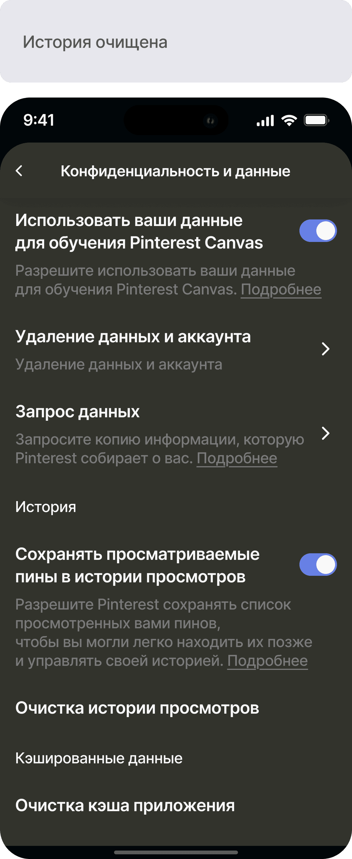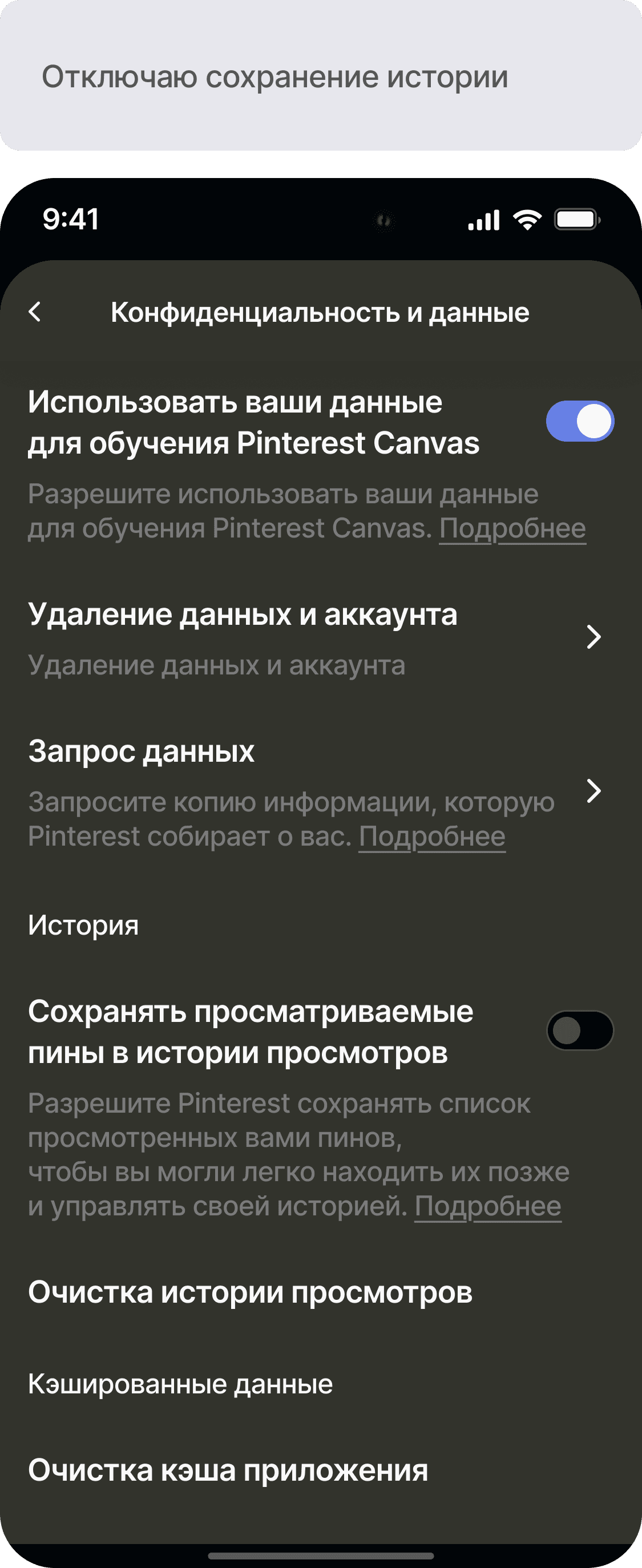 Разработать функционал истории просмотров для приложения Pinterest