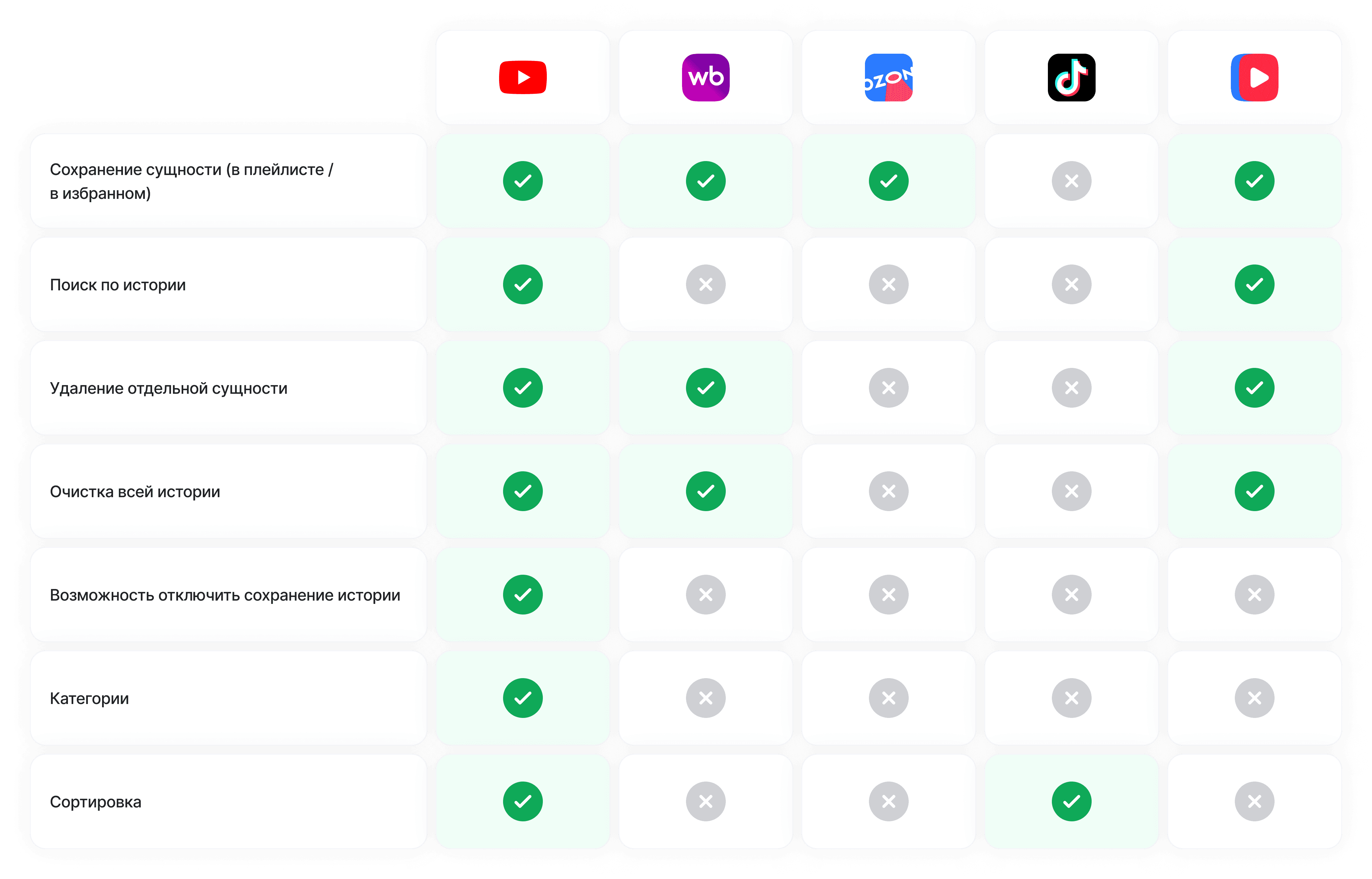 YouTube — единственный сервис, у которого реализованы все представленные функции. Остальные платформы предлагают урезанный функционал, ориентируясь на базовые сценарии;